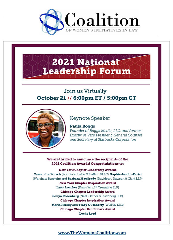 A dear friend and former participant in the WOMN Chicago Chapter 12 Month Mentoring Program, Stephanie Jones, Co-Managing Partner of the Chicago office of Gordon Rees Scully Mansukhani, nominated us to receive the Inspiration Award from the Coalition of Women’s Initiatives in Law.